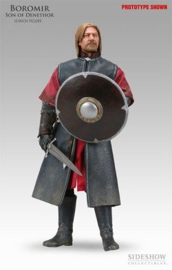 Boromir, heir to the stewardship of Gondor is recreated in this stunning 12-inch figure. Boromir has a fully articulated male body with over 30 points of articulation. The detailed costume includes surcoat, shirt with 'Chainmail' sleeves, tunic, pants, boots, vambraces, detailed belt, sword & scabbard, shield w/ strap, dagger & scabbard, Horn of Gondor, gloved hands and display base with Lord